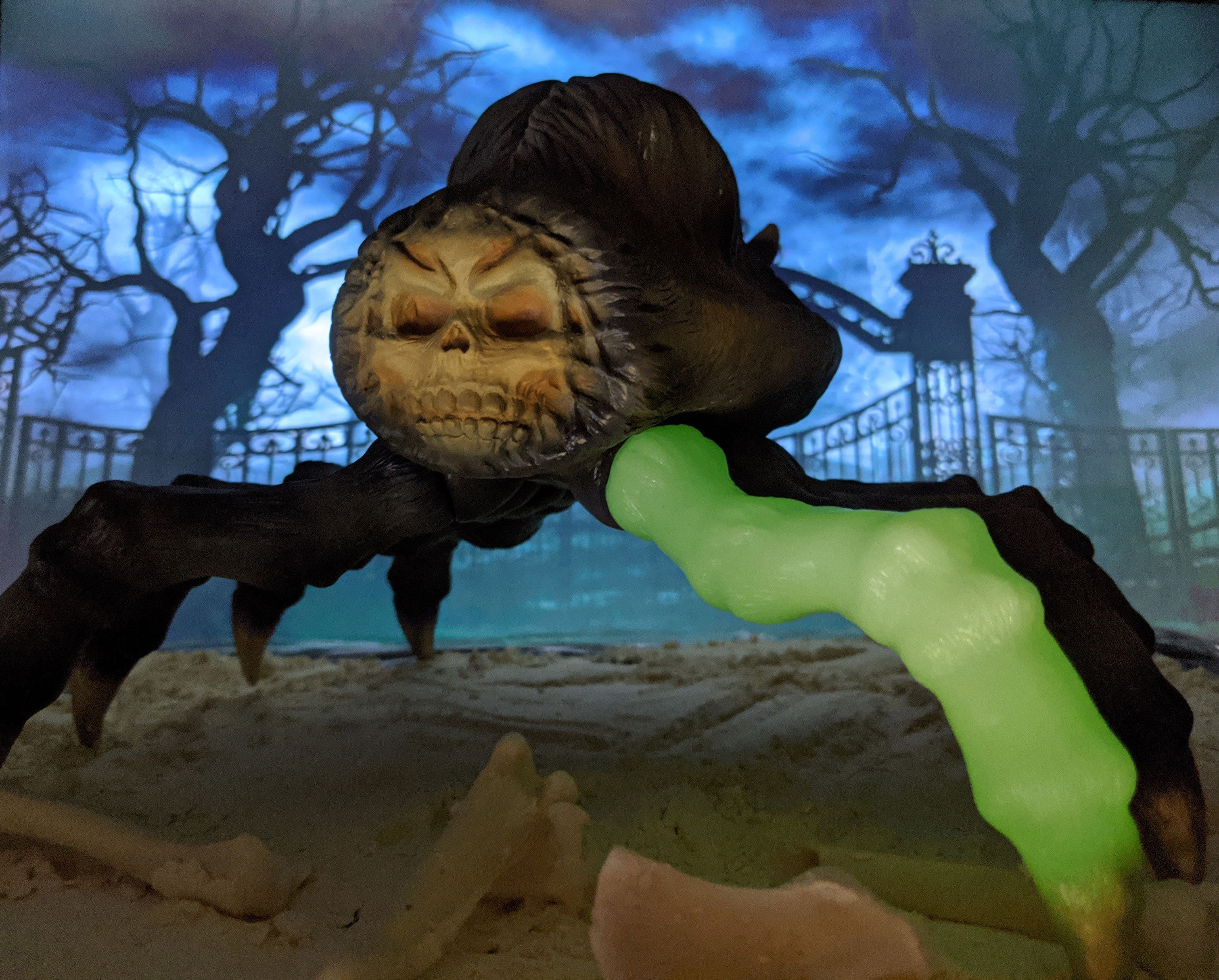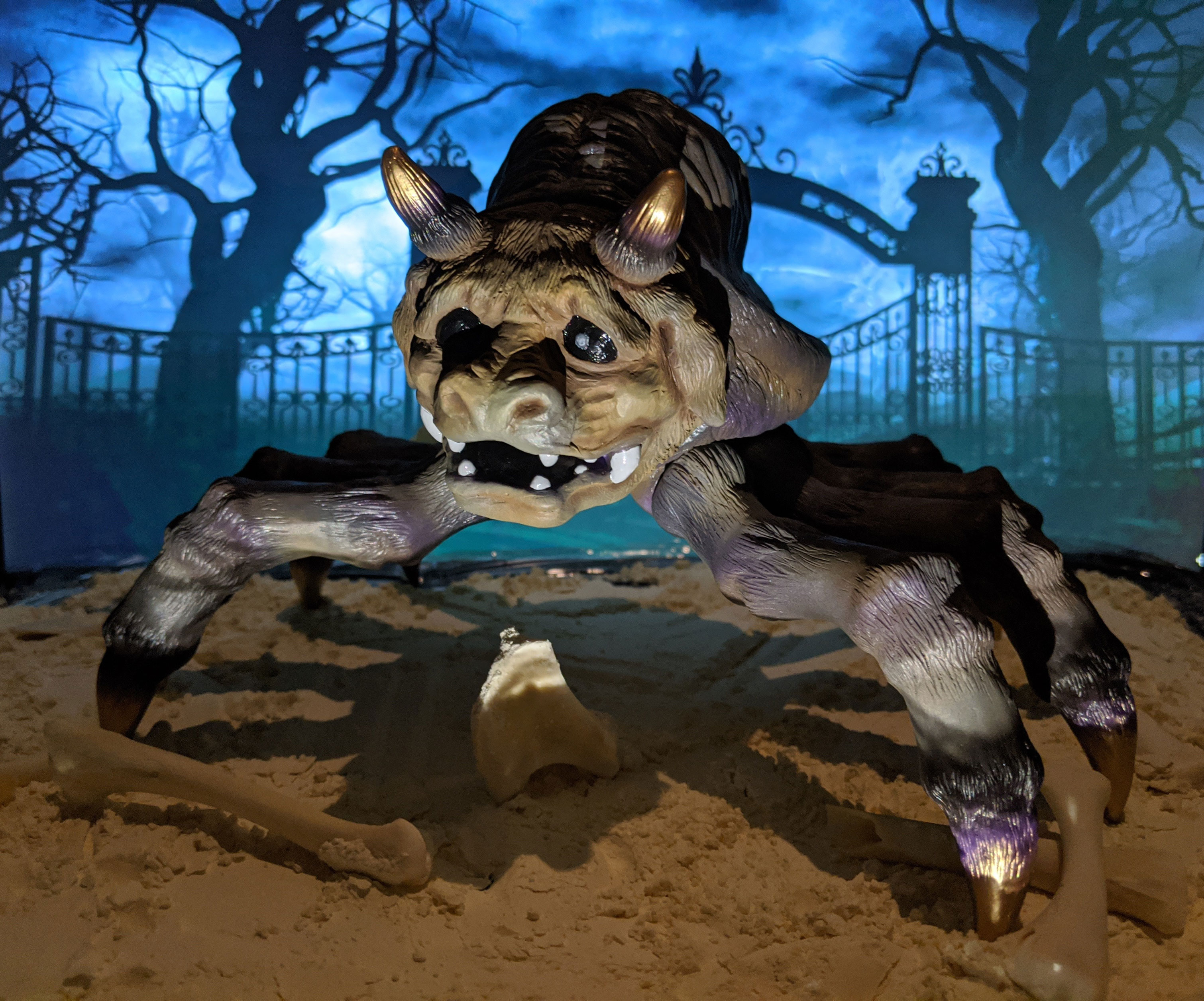 Eater of flesh, The Ghoul's local haunts include graveyards, deserts, and toy collections. Often spotted robbing the graves of the dead. Gold tipped horns and legs are adorned with the plunders of each grave its unearthed. Legs slowly accumulate bacteria from its filthy habits resulting in bioluminescence. Bacteria proves to be beneficial as it illuminates the creatures nightly raids..